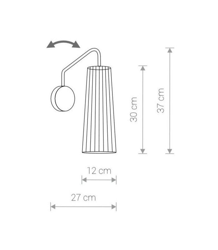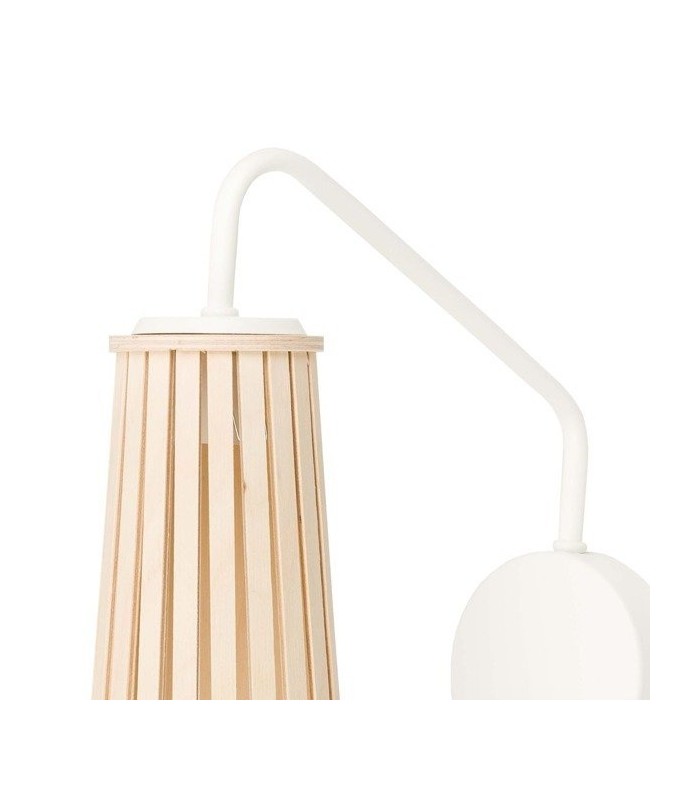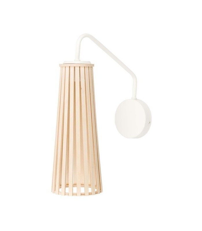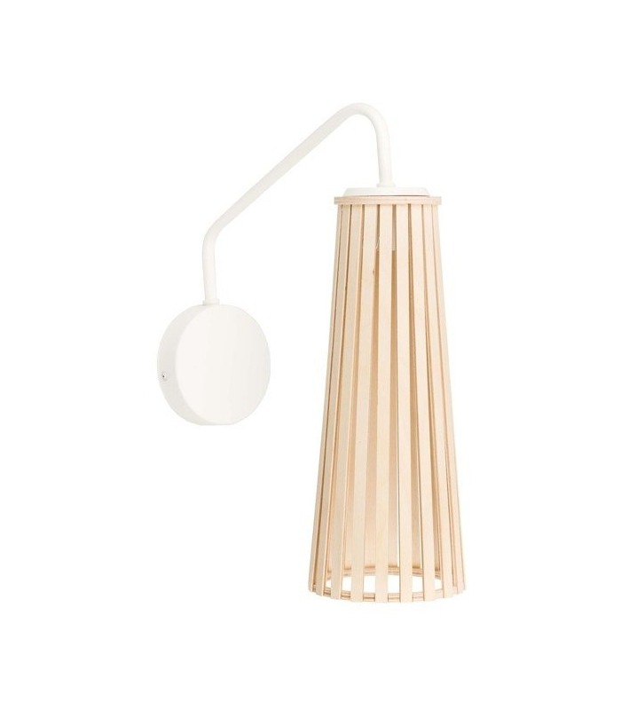 Wykonany z połączenia wysokiej jakości stali lakierowanej w kolorze białym z kloszem z listewek ze sklejki w kolorze naturalnego drewna. Wysokość lampy 37 cm, głębokość 27 cm, wysokość klosza 30 cm, średnica klosza 12 cm. Możliwość stosowania żarówek LED.
