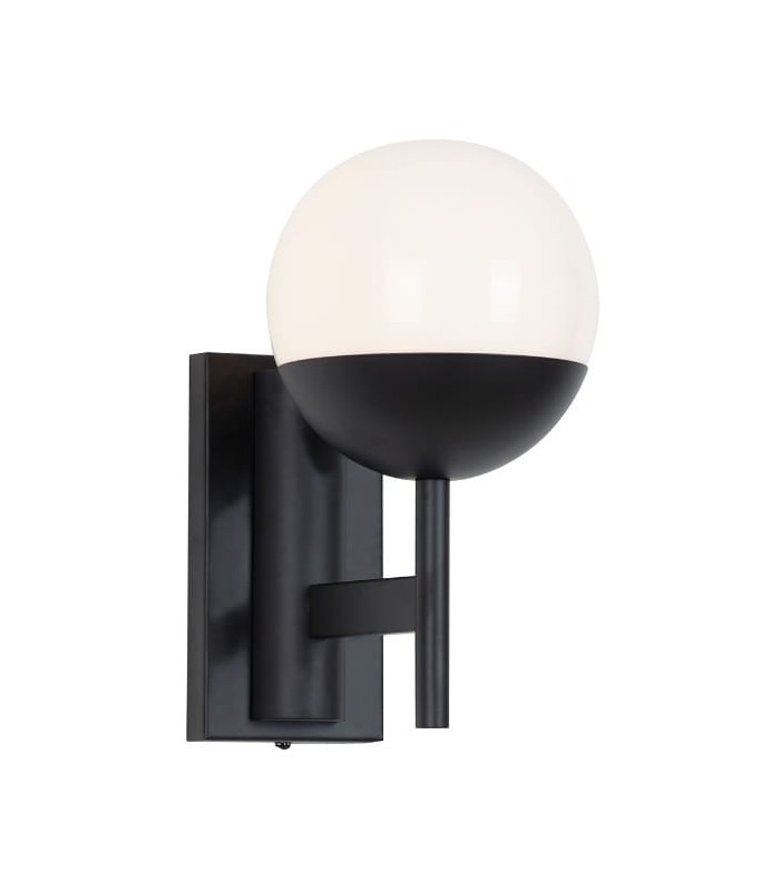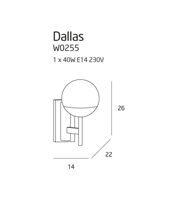 Wykonany z połączenia wysokiej jakości metalu w kolorze czarnym ze szklanym kloszem w kolorze białym. Wysokość lampy 26 cm, szerokość lampy 14 cm, głębokość 22 cm. Możliwość stosowania źarówek LED.