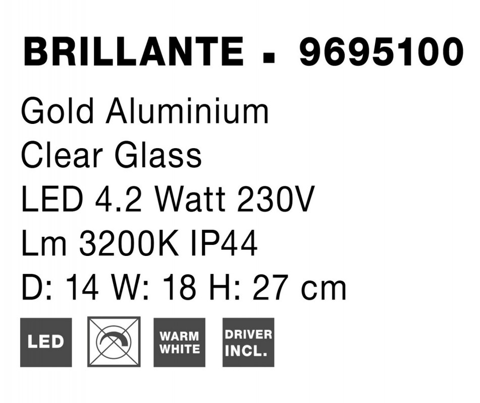 Kinkiet BRILLANTE 9695100 w kolorze złotym który posiada wbudowane źródło światła.