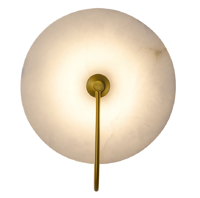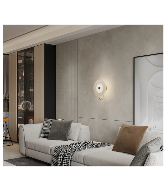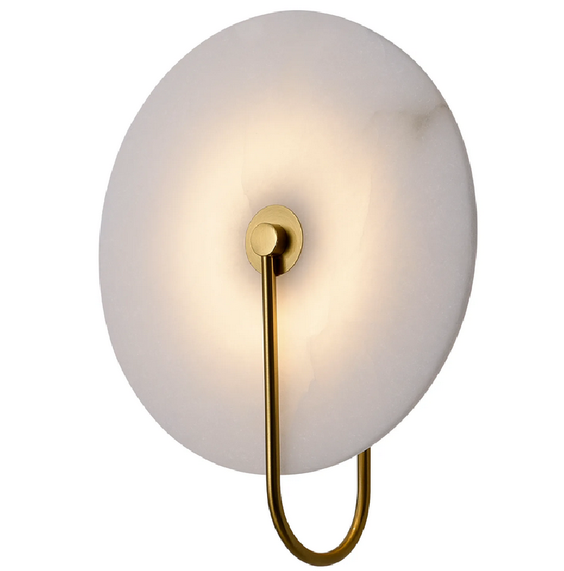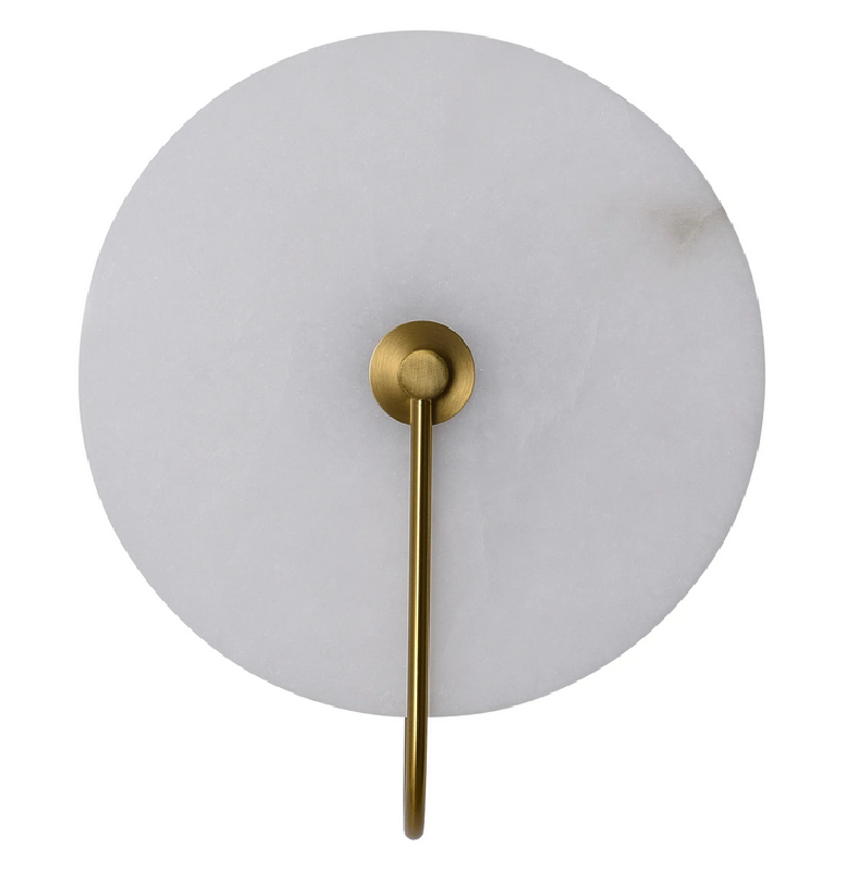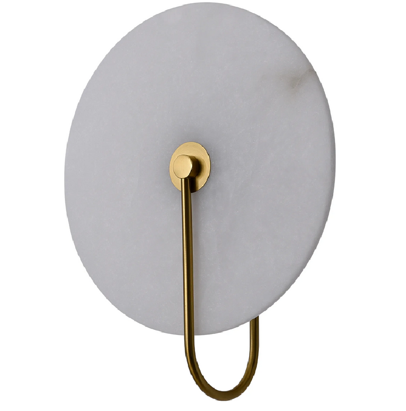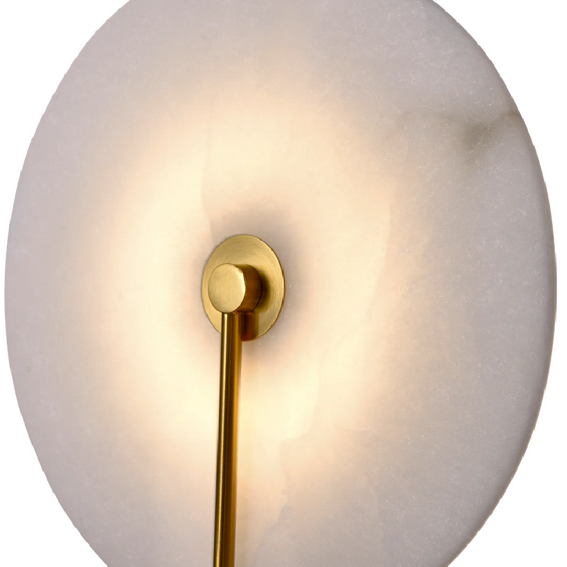 Kinkiet Cyntia to prawdziwe dzieło sztuki oświetleniowej. Wykonany w technologii Led z wysokiej jakości aluminium w kolorze mosiądzu z kloszem w kształcie talerza z naturalnego białego marmuru. Źródłem światła lampy jest wbudowany Led 8W o strumieniu świetlnym 260lm i barwie światła 3000K. Wysokość lampy 32 cm, szerokość lampy 26 cm, głębokość 12,5 cm.
