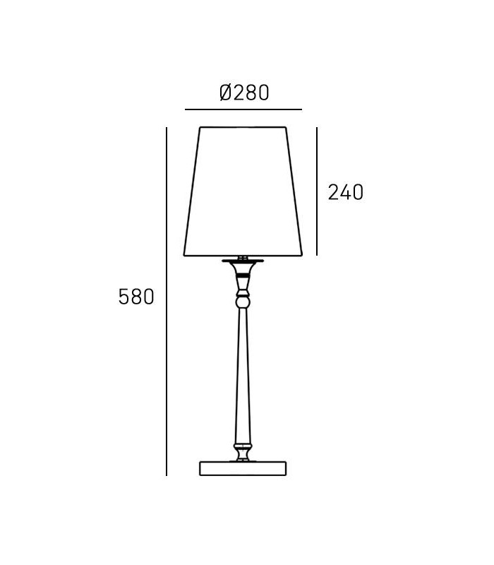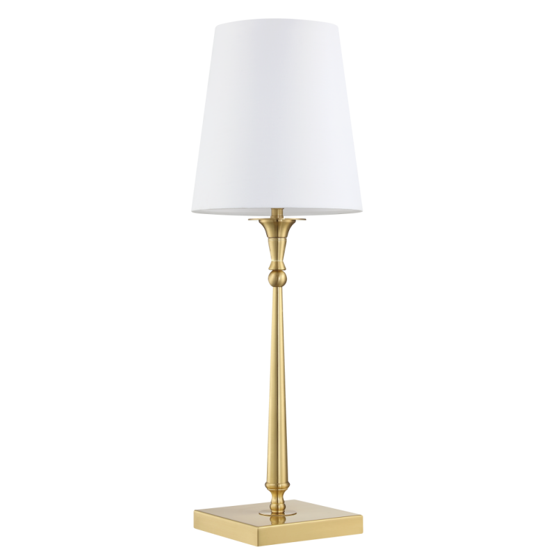 Wykonana z wysokiej jakości metalu w kolorze mosiądz polerowany z tkaninowym kloszem w kolorze białym. Wysokość lampy 58 cm, średnica klosz 28 cm, wysokość klosza 24 cm. Stosować żarówki Led.