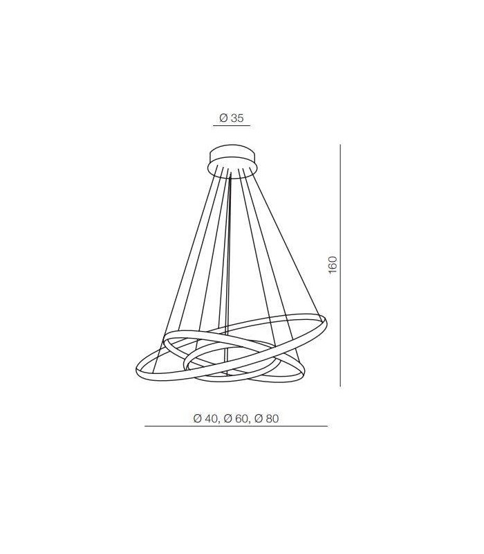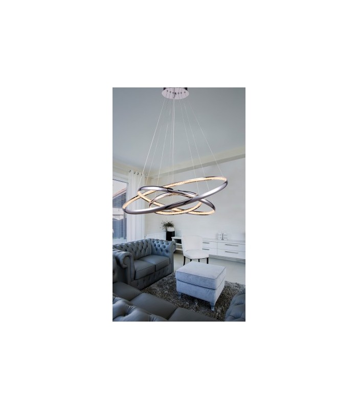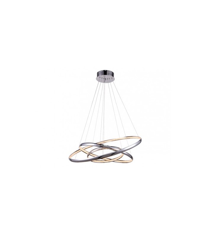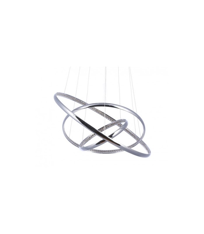 Wykonana w technologii Led z wysokiej jakości aluminium chromowanego z kloszem z trzech kręgów o różnych średnicach, zawieszonych na różnych wysokościach. Maksymalna długość zwisu lampy 160 cm, średnica lampy 80 cm. Źródłem światła lampy jest wbudowany Led 55W o strumieniu świetlnym 3300lm i barwie światła 3000K, zamontowy po wewnętrznej stronie kręgu i osłonięty dekoracyjnymi kryształkami.