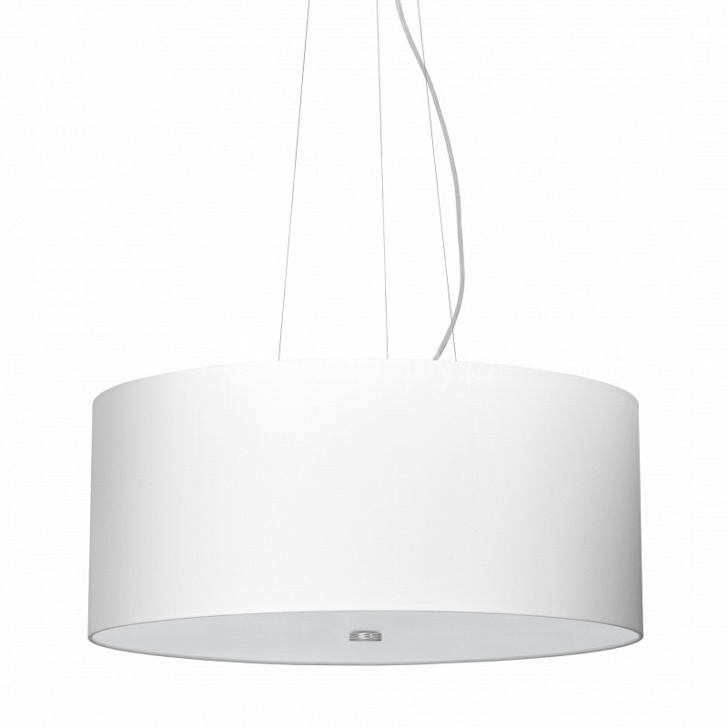 Lampa wykonana z wysokiej jakości metalu i tkaniny w kolorze białym ze szklaną białą przesłoną na białym kablu. Długość zwisu lampy 110 cm, średnica klsza 60 cm, wysokość klosza 25 cm. Możliwość stosowania żarówek LED.