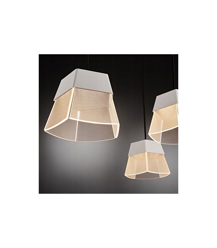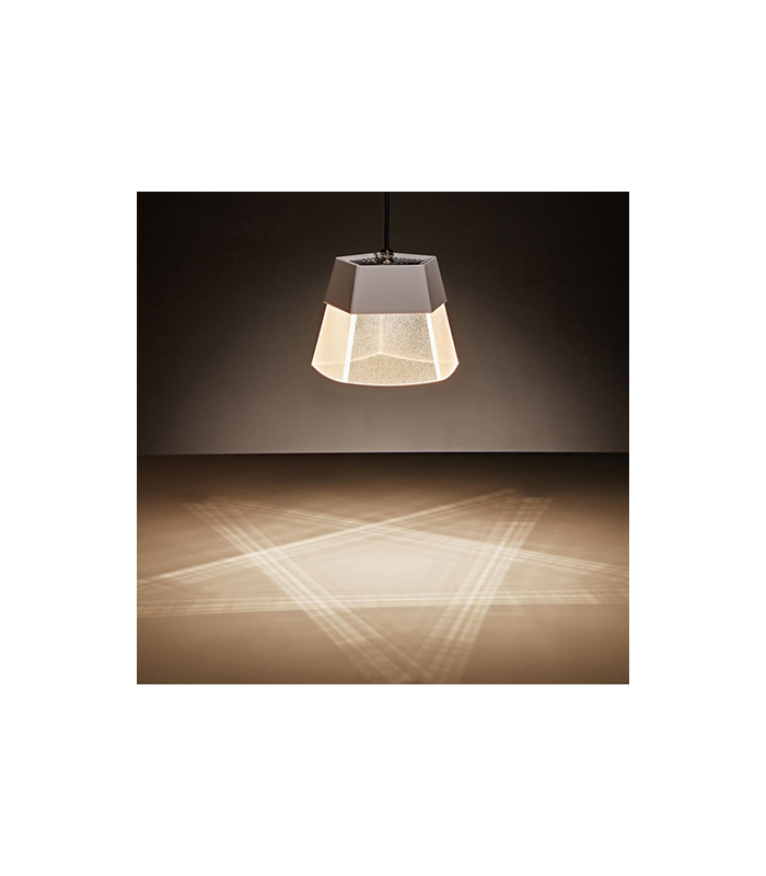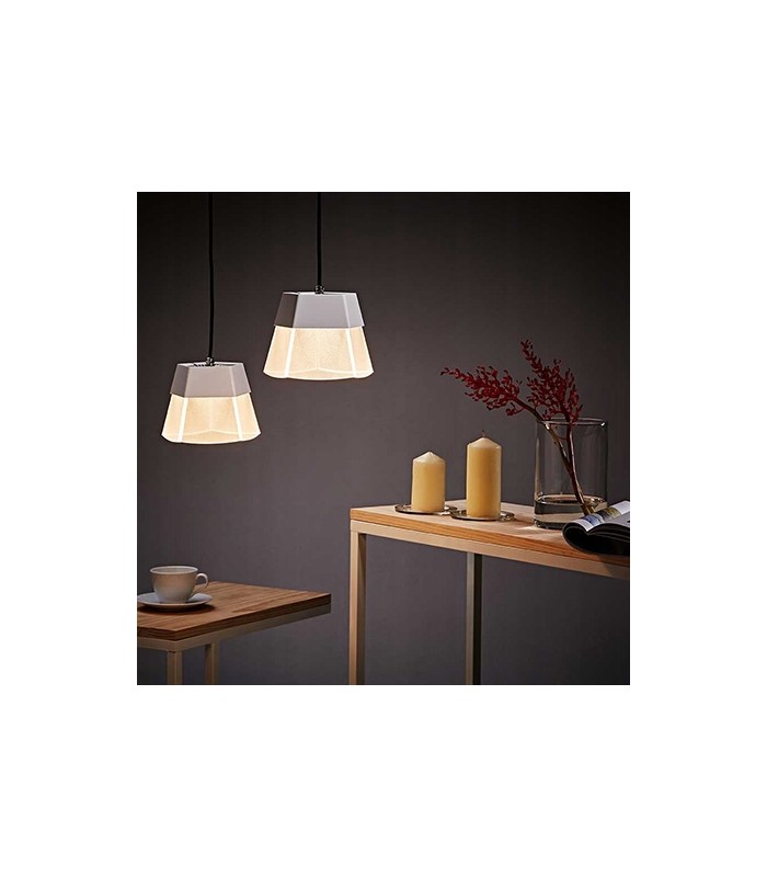 Lampa ściemnialna, wykonana w technologi Led z wysokiej jakości aluminium anodowanego, PMMA i tworzywa w kolorze białym na czarnym kablu z wbudowanym źródłem światła Led 6W o strumieniu świetlnym 276lm i barwie światła 2700K. Długość zwisu lampy 150 cm, średnica kosza lampy 16 cm, wysokość klosza lampy 12,1 cm.