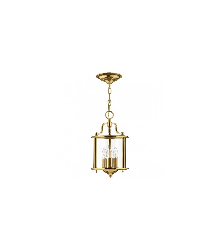 Lampa w kształcie latarenki, wykonana z metalu w kolorze polerowanenego mosiądzu i szkła transparemtnego z widocznymi źródłami światła. Maksymalna długość zwisu lampy 192,5 cm, średnica lampy 20,3 cm, wysokość klosza 30,5 cm. Możliwość zastosowania żarówek LED.