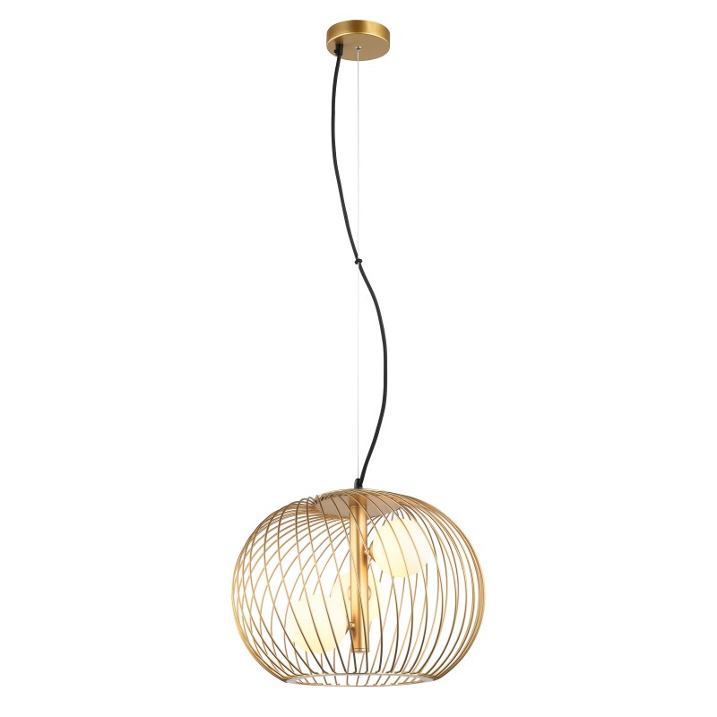 Wykonana z wysokiej jakości metalu w kolorze złotym z drucianym kloszem z zewnątrz i trzema szklanymi, białymi kloszami w środku. Maksymalna długość zwisu 107 cm, średnica lampy 43 cm, wysokość klosza 37 cm. Możliwość stosowania żarówek LED.