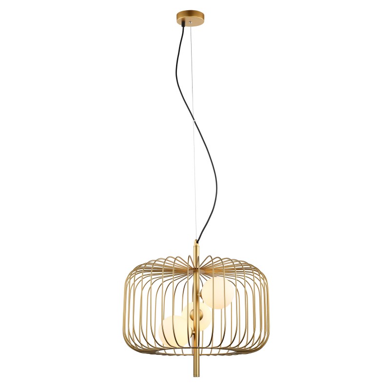 Wykonana z wysokiej jakości stali w kolorze złotym z drucianym kloszem z zewnątrz i trzema szklanymi, białymi kloszami w środku. Maksymalna długość zwisu 113 cm, średnica lampy 45 cm, wysokość klosza 43 cm. Możliwość stosowania żarówek LED.