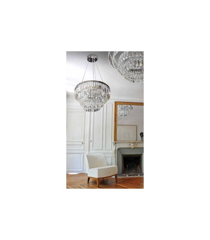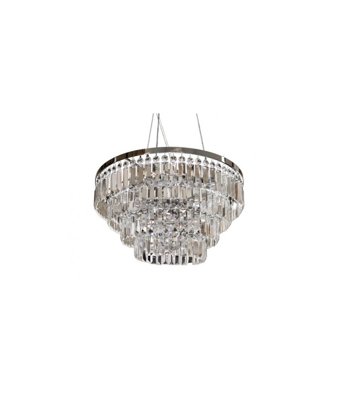 Wykonana w stylu glamour z wysokiej jakości metalu chromowanego z kloszem z niezliczoną ilością szlifowanych kryształowych elementów, które pięknie odbijają światło. Maksymalna długość zwisu lampy 120 cm, średnica lampy 57 cm, wysokość klosza 40 cm. Możliwość stosowania żarówek LED.