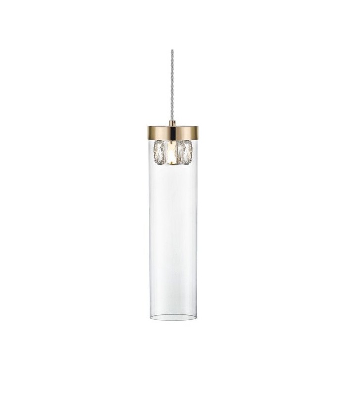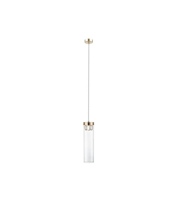 Wykonana z wysokiej jakości metalu w kolorze złotym ze szklanym transparentnym kloszem w kształcie smukłej tuby w środku której umieszczono kryształowy element ozdobny, osłaniający źródło światła. Długość zwisu lampy 43-153 cm, średnica klosza 11 cm, wysokość klosza 27 cm. Możliwość stosowania żarówek LED.