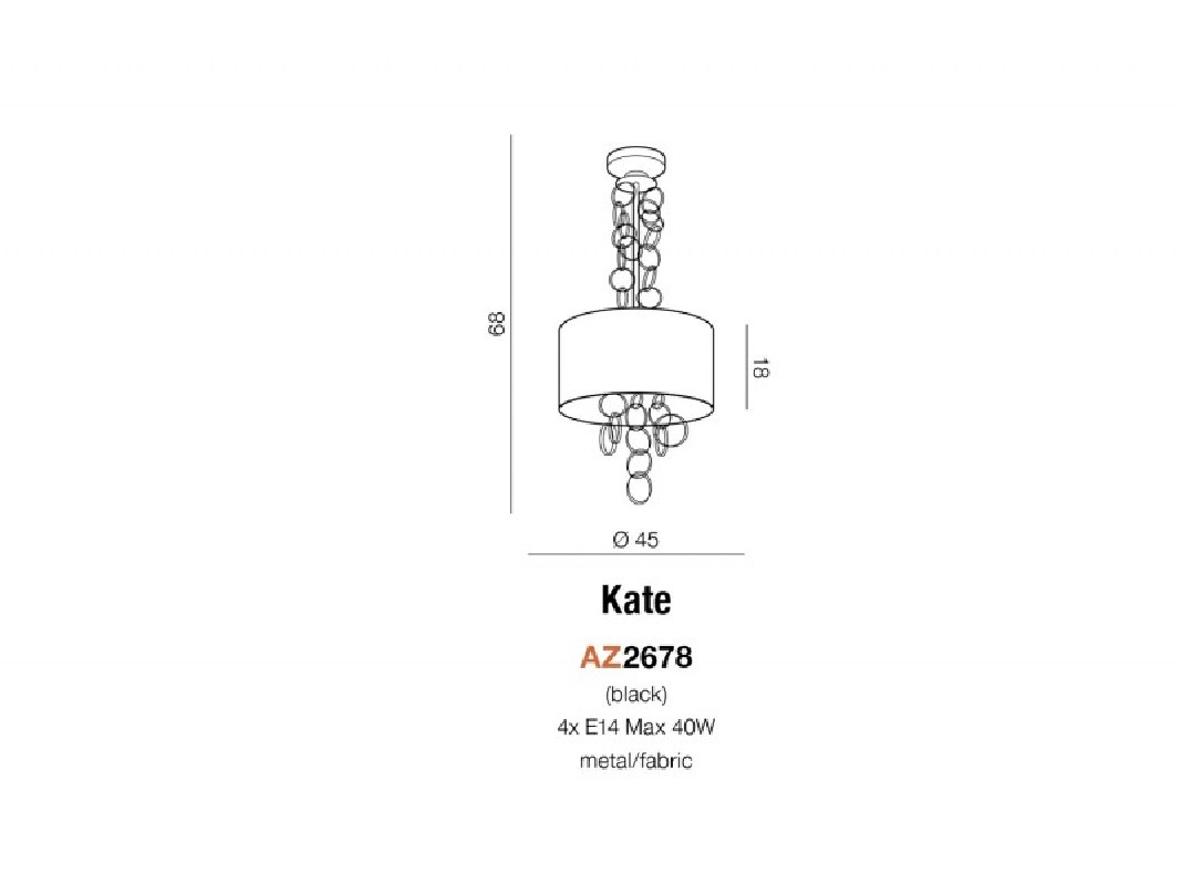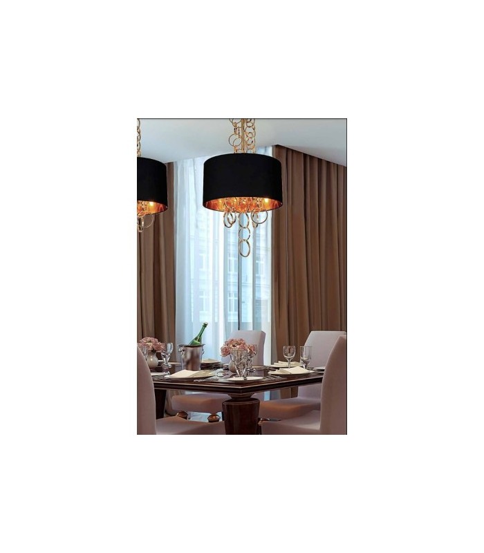Lampa wykonana z metalu w kolorze złotym z tkaninowym kloszem w kolorze czarnym z zewnątrz i złotym w środku, przyozdobiona okrągłymi złotymi ogniwami. Długość zwisu lampy 68 cm, średnica 45 cm, wysokość klosza 18 cm. Możliwość stosowania żarówek LED.