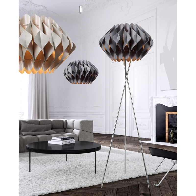 Lampa wiszaca, wykonana z wysokiej jakości metalu chromowanego z ozdobnym kloszem z tworzywa w kolorze szarym. Długość zwisu lampy 100 cm, średnica lampy 50 cm. Możliwość stosowania żarówek Led.