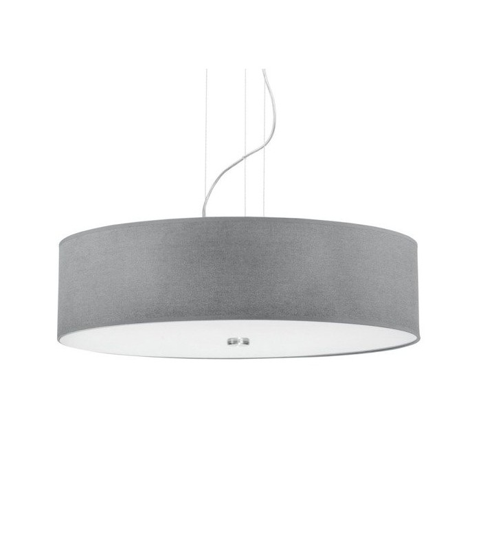 Wykonana z połączenia wysokiej jakości stali chromowanej z tkaninowym abażurem w kolorze szarym i szklaną przesłoną od spodu lampy. Długość zwisu lampy 110 cm, średnica klosza 63,5 cm, wysokość klosza 16 cm. Możliwość stosowania żarówek LED.