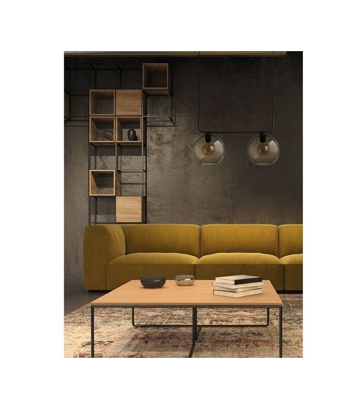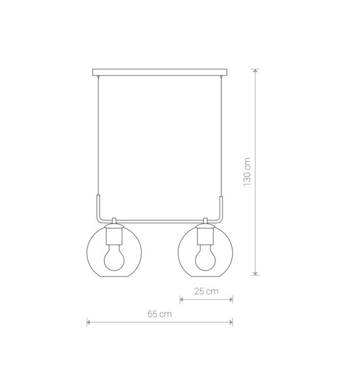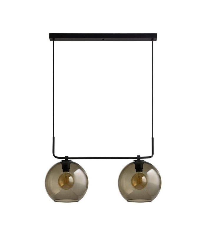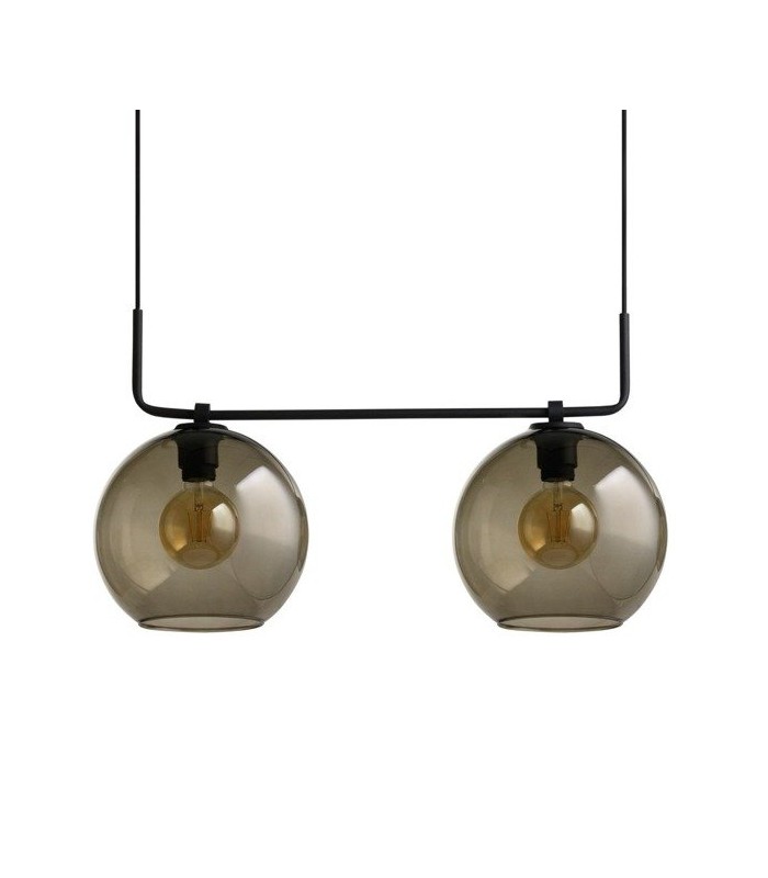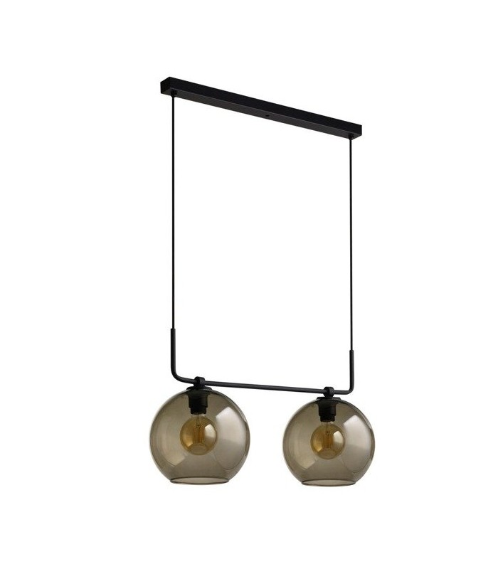Lampa na listwie, wykonana z wysokiej jakości stali lakierowanej w kolorze czarnym z kloszami w kształcie kul ze szkła dymionego. Długość zwisu lampy 130 cm, szerokość lampy 65 cm, średnica klosza 25 cm. Możliwość stosowania żarówek Led