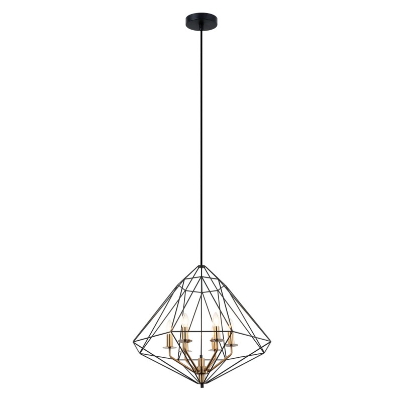 Wykonana z wysokiej jakości stali w kolorze czarnym z kloszem o geometrycznym kształcie w środku, którego na złotych świecznikach umieszczono źródła światła. Maksymalna długość zwisu lampy 119 cm, szerokość lampy 65 cm x 65 cm. Możliwość zastosowania żarówek LED.