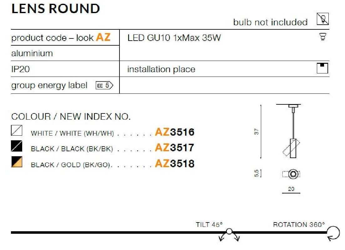 Wykonana z wysokiej jakości aluminium w kolorze czarnym z regulowanym kloszem w kształcie wąskiej tuby z zewnątrz czarnej i złotej w środku. Długość zwisu lampy 37 cm, szerokość lampy 20 cm, średnica klosza 5,5 cm. Możliwość stosowania źarówek Led