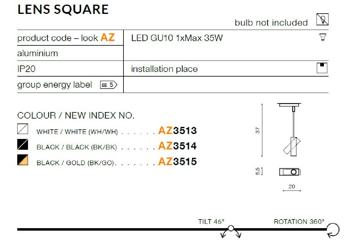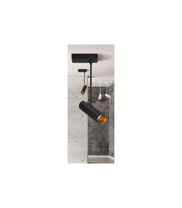 Wykonana z wysokiej jakości aluminium w kolorze czarnym z regulowanym kloszem w kształcie wąskiej tuby z zewnątrz czarnej i złotej w środku. Długość zwisu lampy 37 cm, szerokość lampy 20 cm, średnica klosza 5,5 cm. Możliwość stosowania źarówek Led