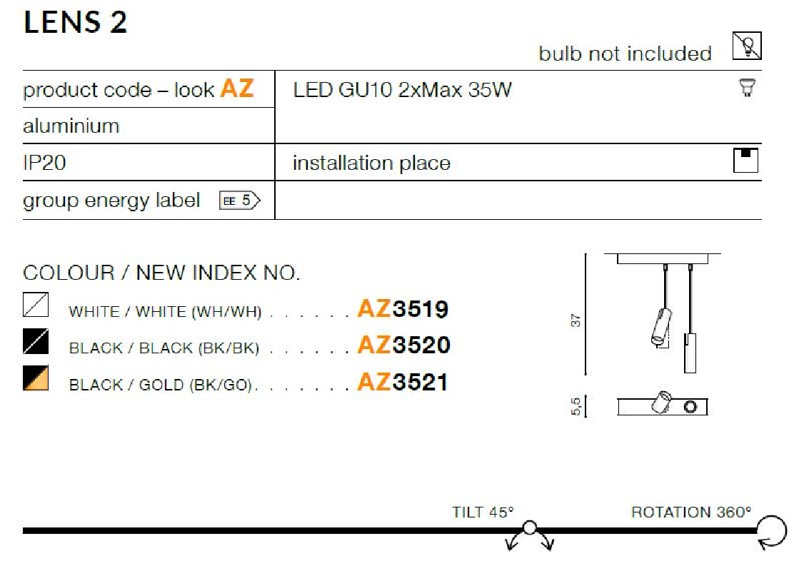 Wykonana z wysokiej jakości aluminium w kolorze białym z regulowanymi kloszami w kształcie wąskich tub. Długość zwisu lampy 37 cm, szerokość lampy 20 cm, średnica klosza 5,5 cm. Możliwość stosowania źarówek Led