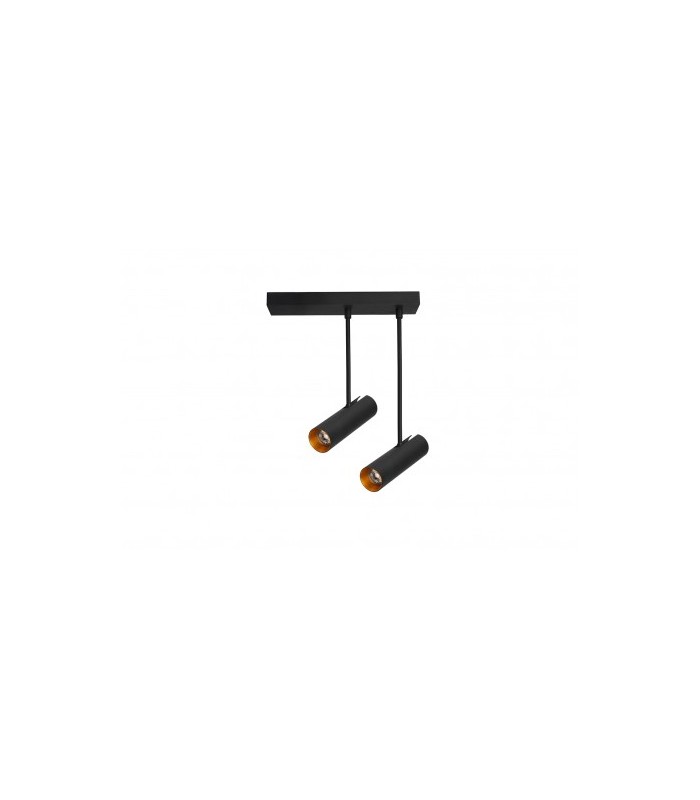 Wykonana z wysokiej jakości aluminium w kolorze czarnym z regulowanymi kloszami w kształcie wąskich tub, które z zewnątrz są czarne, a wewnątrz złote. Długość zwisu lampy 37 cm, szerokość lampy 20 cm, średnica klosza 5,5 cm. Możliwość stosowania źarówek Led