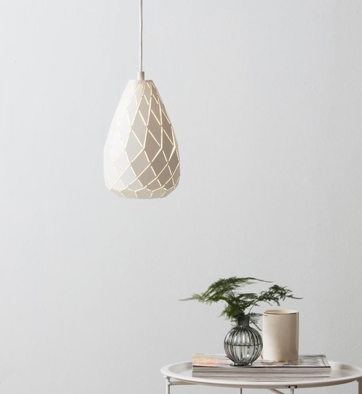 Wykonana z połączenia wysokiej jakości metalu w kolorze białym z kloszem o geometrycznym kształcie. Maksymalna długość zwisu lampy 350 cm, średnica lampy 15 cm, wysokość klosza 26 cm. Możliwość stosowania żarówek LED.