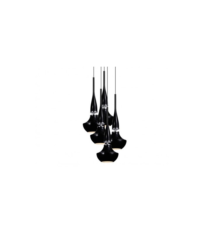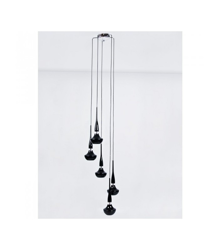 Wykonana z wysokiej jakości metalu chromowanego z kloszami o nietuzinkowym kształcie z czarnego szkła. Maksymalna długość zwisu lampy 260 cm, średnica lampy 46 cm, średnica pojedyńczego klosza 16 cm. Możliwość stosowania żarówek LED.