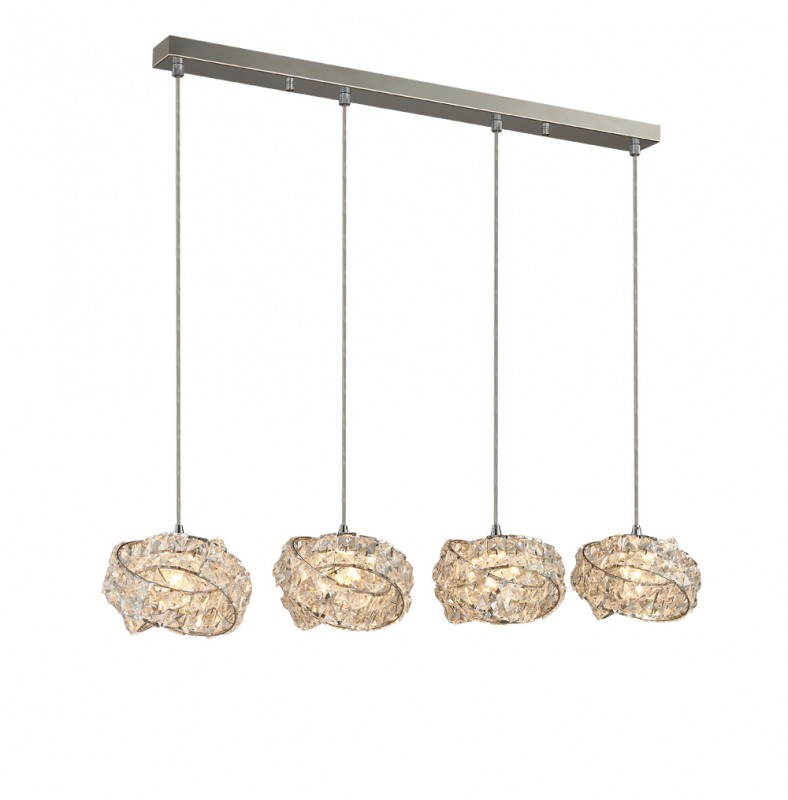 Lampa na listwie, wykonana z wysokiej jakości metalu chromowanego z kloszami o nietuzinkowym kształcie z przeplatających się obręczy ze szlifowanych kryształów ściśle ułożonych obok siebie. Długość zwisu lampy 120 cm, szerokość lampy 87 cm. Możliwość stosowania żarówek Led