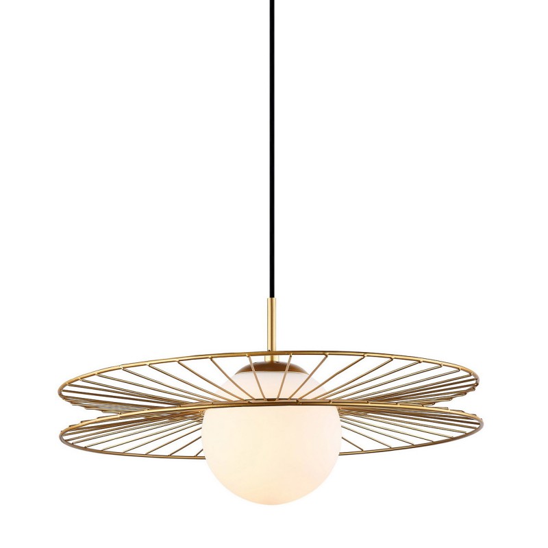 Wykonana z wysokiej jakości stali w kolorze złotym i szkła w kolorze białym z dwoma kloszami. Szklany klosz w kształcie kuli osłania źródło światła, druciany natomiast jest elementem ozdobnym lampy. Maksymalna długość zwisu 90 cm, średnica lampy 45 cm, wysokość klosza 20 cm. Możliwość stosowania żarówek LED.