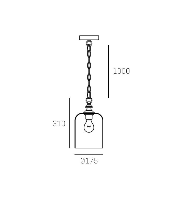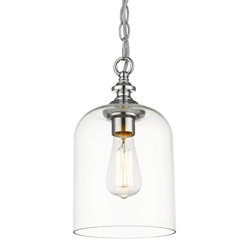 Wykonana z wysokiej jakości metalu chromowanego z kloszem z transparentnego szkła. Długość zwisu lampy 131 cm, średnica klosza 17,5 cm, wysokość klosza 31 cm. Możliwość stosowania żarówek Led