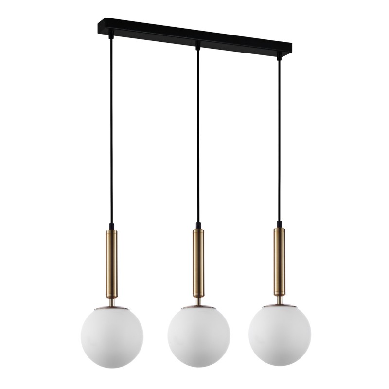 Wykonana z wysokiej jakości stali w kolorze mosiądzu z kloszami w kształcie kul z białego szkła na czarnych kablach. Maksymalna długość zwisu lampy 107,8 cm, szerokość lampy 65 cm, średnica klosza 15 cm. Stosować żarówki Led. Dostępna cała seria