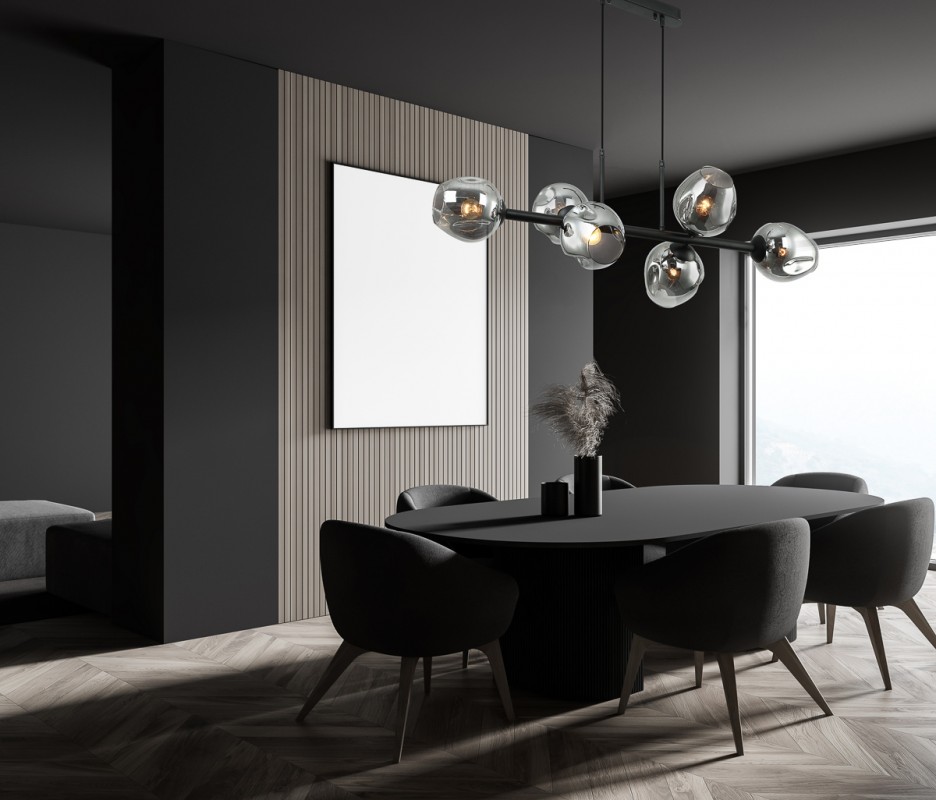 Wykonana z połączenia wysokiej jakości metalu w kolorze czarnym z kloszami ze szkła przydymionego z owalnymi wgłębieniami. Maksymalna długość zwisu 97 cm, szerokość lampy 100 cm, wysokość klosza 30 cm. Możliwość stosowania żarówek LED.