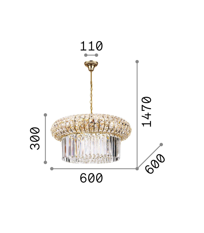 Wykonana z wysokiej jakości metalu w kolorze złotym z kloszem ze szlifowanych kryształów o różnych kształtach, które pięknie odbijają światło. Maksymalna długość zwisu lampy 147 cm, średnica lampy 60 cm, wysokość klosza 30 cm. Możliwość stosowania żarówek Led