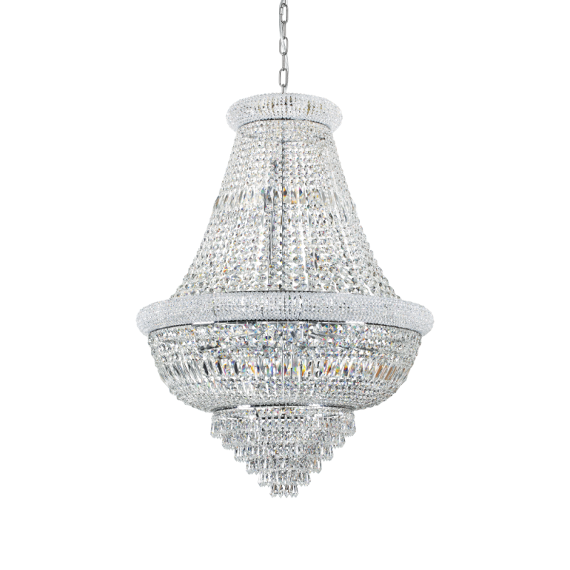 Wykonana z wysokiej jakości metalu chromowanego z kloszem ze szlifowanych kryształów o różnych kształtach i wielkościach, które pięknie odbijają światło. Maksymalna długość zwisu lampy 225 cm, średnica lampy 80 cm, wysokość klosza 105 cm. Możliwość stosowania żarówek Led