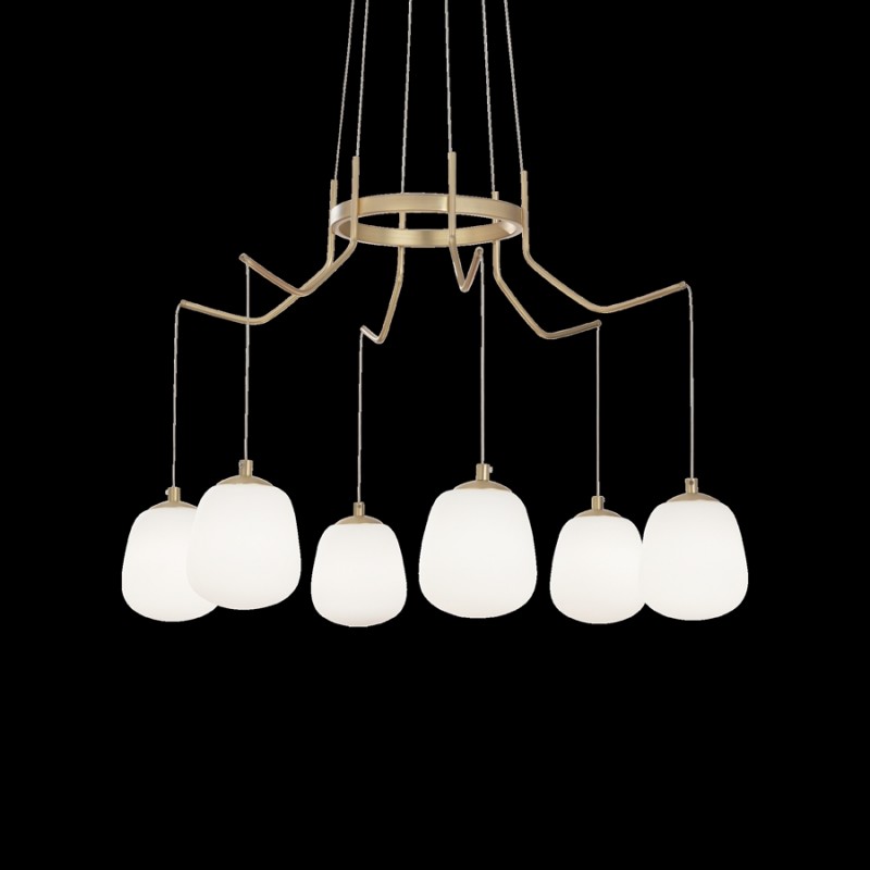 Wykonana z wysokiej jakości metalu w kolorze satynowy mosiądz z kloszami o owalnym kształcie z dmuczanego szkła w kolorze białym. Długość zwisu lampy 127 cm, średnica lampy 72 cm. Możliwość stosowania żarówek Led
