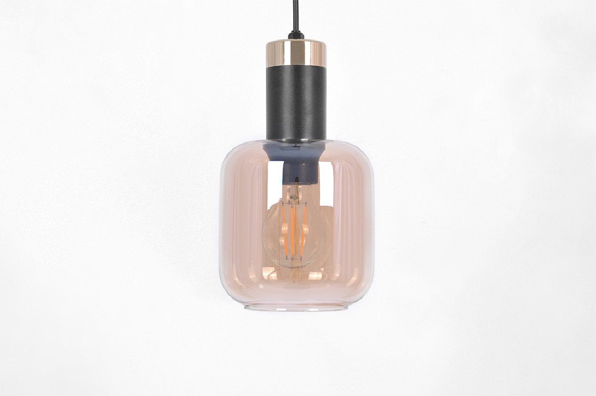 Wykonana z wysokiej jakości metalu w kolorze czarnym ze złotym elementem ozdobnym, kloszem ze szkła bursztynowego na czarnym kablu. Maksymalna długość zwisu lampy 90 cm, średnica lampy 13 cm, wysokość klosza 25 cm. Stosować żarówki Led