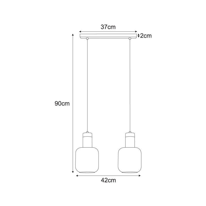 Lampa na listwie, wykonana z wysokiej jakości metalu w kolorze czarnym ze złotymi elementami ozdobnymi i kloszami ze szkła bursztynowego na czarnych kablach. Maksymalna długość zwisu lampy 90 cm, szerokość lampy 42 cm x 13 cm, średnica klosza 13 cm, wysokość klosza 25 cm. Stosować żarówki Led. Polecana żarówka Led filament