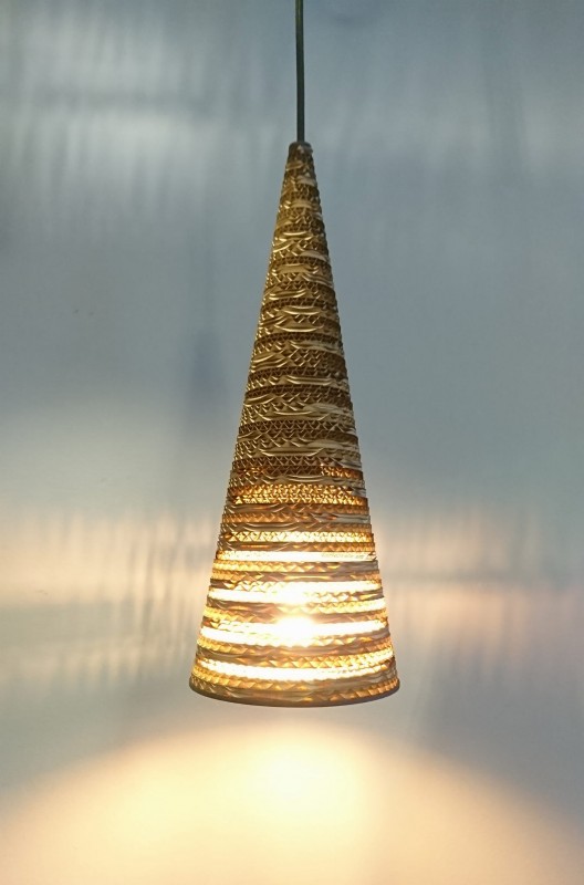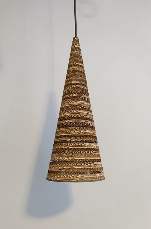 Ekologoczna lampa wisząca, wykonana ręcznie z tektury falistej i sklejki brzozowej z kloszem w kształcie stożka w odcieniach brązu. Elementy klosza lampy cięte laserem i sklejane ręcznie klejem nie emitującym szkodliwych substancji, zaimpregnowana lakierem akrylowym. Długość zwisu lampy 120 cm, średnica klosza lampy 15 cm, wysokość klosza 40 cm Stosować żarówki Led.