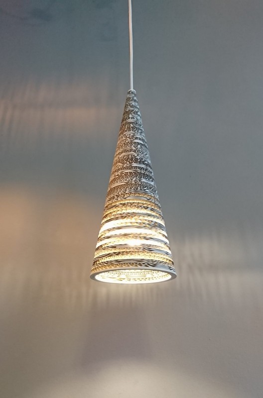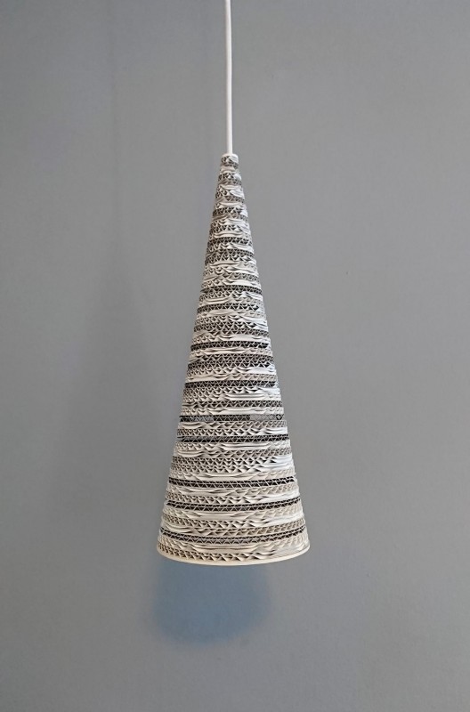 Ekologoczna lampa wisząca, wykonana ręcznie z tektury falistej i sklejki brzozowej z kloszem w kształcie stożka w odcieniach szarości. Elementy klosza lampy cięte laserem i sklejane ręcznie klejem nie emitującym szkodliwych substancji, zaimpregnowana lakierem akrylowym. Długość zwisu lampy 120 cm, średnica klosza lampy 15 cm, wysokość klosza 40 cm Stosować żarówki Led.