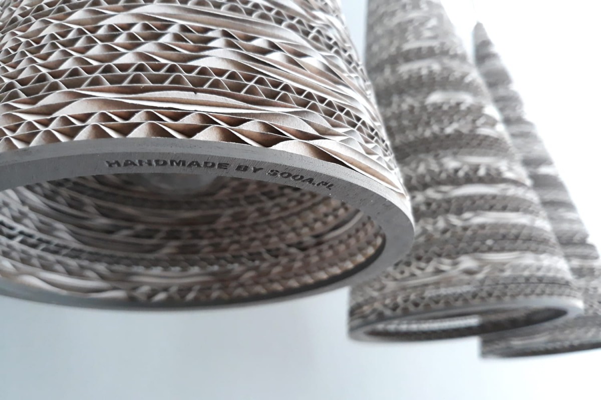 Ekologoczna lampa wisząca na listwie, wykonana ręcznie z tektury falistej i sklejki brzozowej z kloszami w kształcie stożków w odcieniach szarości. Elementy klosza lampy cięte laserem i sklejane ręcznie klejem nie emitującym szkodliwych substancji, zaimpregnowana lakierem akrylowym. Długość zwisu lampy 81 cm, szerokość lampy 61 cm x 15 cm, wysokość klosza 40 cm Stosować żarówki Led.