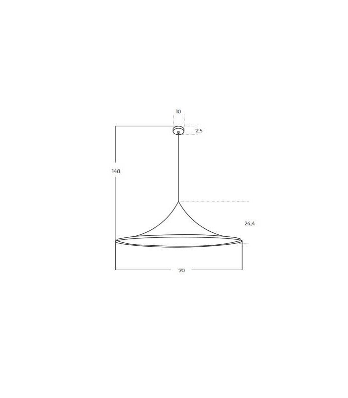 Wykonana z wysokiej jakości aluminium w kolorze białym z kloszem w kształcie stożka na czarnym kablu. Długość zwisu lampy 148 cm, średnica klosza 70 cm, wysokość klosza 24,4 cm. Stosować żarówki Led