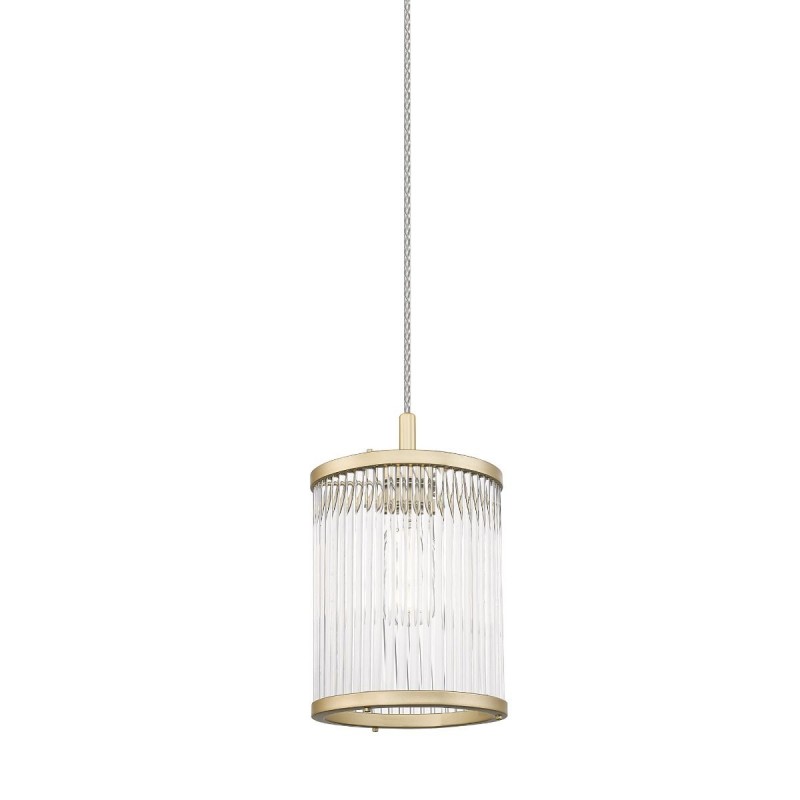 Wykonana z wysokiej jakości metalu w kolorze złotym z kloszem w kształcie walca ze szklanych transparentnych rurek. Długość zwisu lampy 50-150 cm, średnica lampy 15 cm, wysokość klosza 26 cm. Stosować żarówki Led.