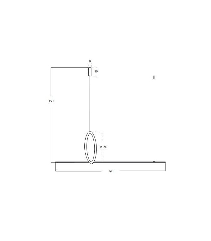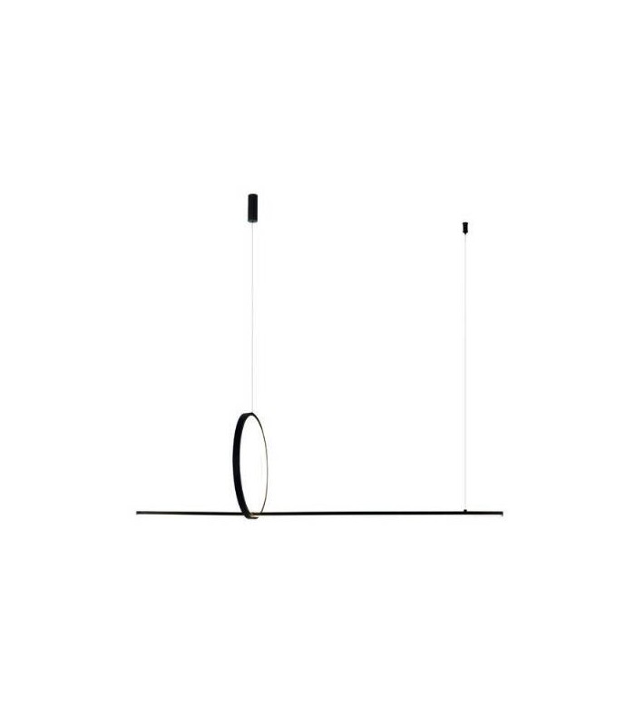 Lampa ściemnialna, wykonana w technologii Led z wysokiej jakości aluminium w kolorze czarnym z kloszem o nietuzinkowej formie, która jest połączeniem prostej belki ze świecącą obręczą. Źródłem światła lampy jest wdudowany Led 30W o strumieniu świetlnym 2440lm i barwie światła 3000K. Maksymalna długość zwisu lampy 150 cm, szerokość lampy 120 cm, średnica obręczy 36 cm.