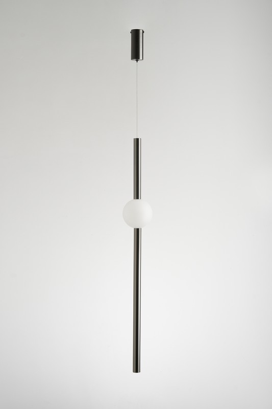 Wykonana z wysokiej jakości metalu w kolorze czarnym z kloszem w kształcie długiej tuby z okrągłym elementem świecącym z białego tworzywa. Żródłem światła lampy jest wbudowany led 5W o strumieniu świetlnym 460lm i barwie światła 3000K. Maksymalna długość zwisu lampy 305 cm, średnica lampy 12 cm, wysokość klosza lampy 93 cm.