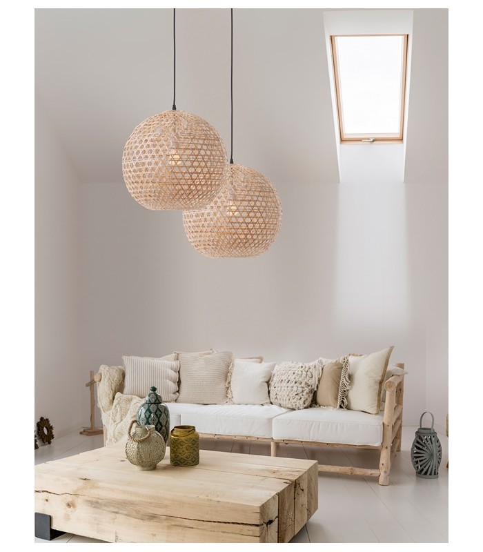 Wkonana z wysokiej jakości metalu w kolorze czarnym z plecionym kloszem wykonanym z rattanu w kolorze naturalnym na czarnym kablu. Maksymalna długość zwisu lampy 250 cm, średnica klosza 40 cm, wysokość klosza 37 cm. Stosować żarówki Led