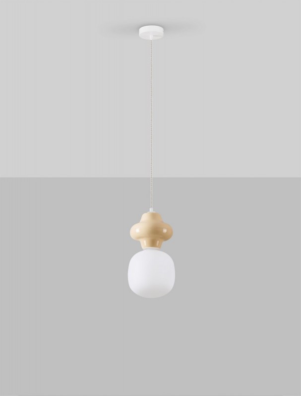 Lampa wisząca Clio beżowa to wyjątkowe połączenie nowoczesnego designu z subtelna elegancją. Jej nietypowa forma złożona z dwóch elementów o owalnych kształtach tworzy harmonijną kompozycję, białego szkła i ceramiki w kolorze beżowym wprowadzając do wnętrza spokój przytulną atmosferę.