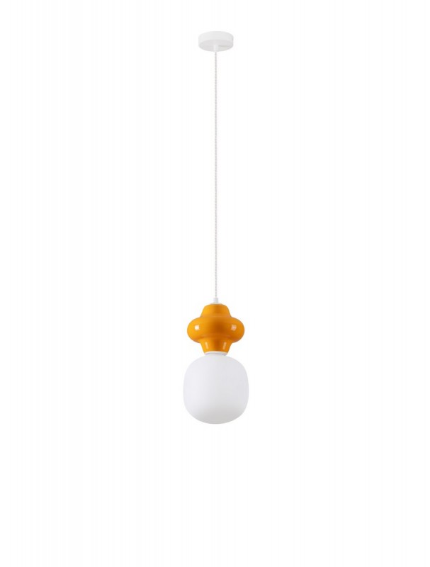 Lampa wisząca Clio pomarańczowa to wyjątkowe połączenie nowoczesnego designu z subtelna elegancją. Jej nietypowa forma złożona z dwóch elementów o owalnych kształtach tworzy harmonijną kompozycję, białego szkła i ceramiki w kolorze pomarańczowym wprowadzając do wnętrza spokój przytulną atmosferę.