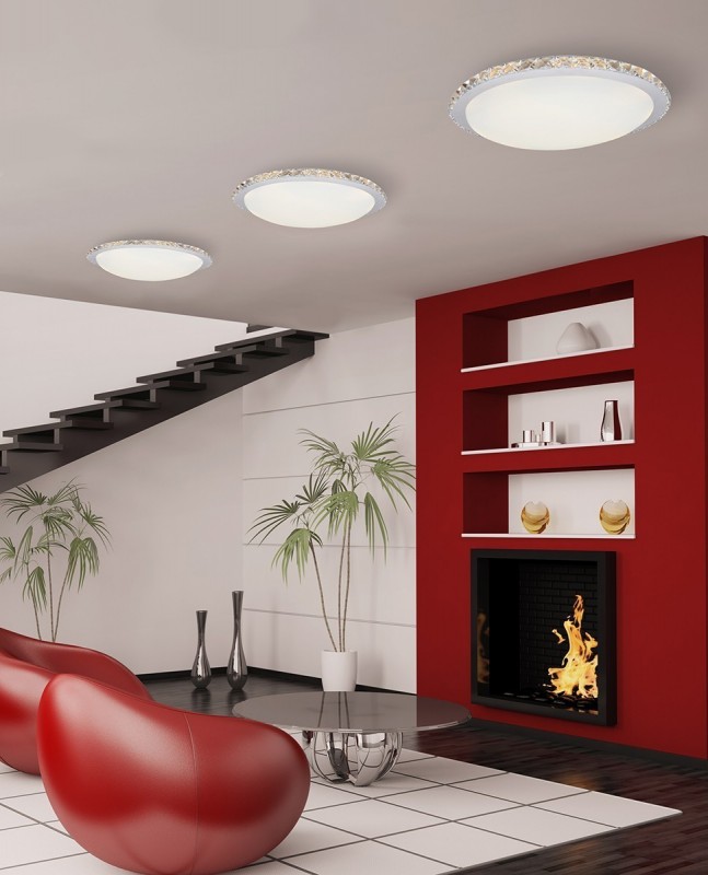 Wykonany w technologii Led z wysokiej jakości metalu chromowanego z przesłoną z mlecznego szkła, przyozdobiony szlifowanymi kryształkami ułożonymi ściśle obok siebie. Źródłem światła lampy jest wbudowany Led 24W o strumieniu świetlnym 1440lm i barwie światła 3000K. Wysokość lampy 10 cm, średnica lampy 40 cm.