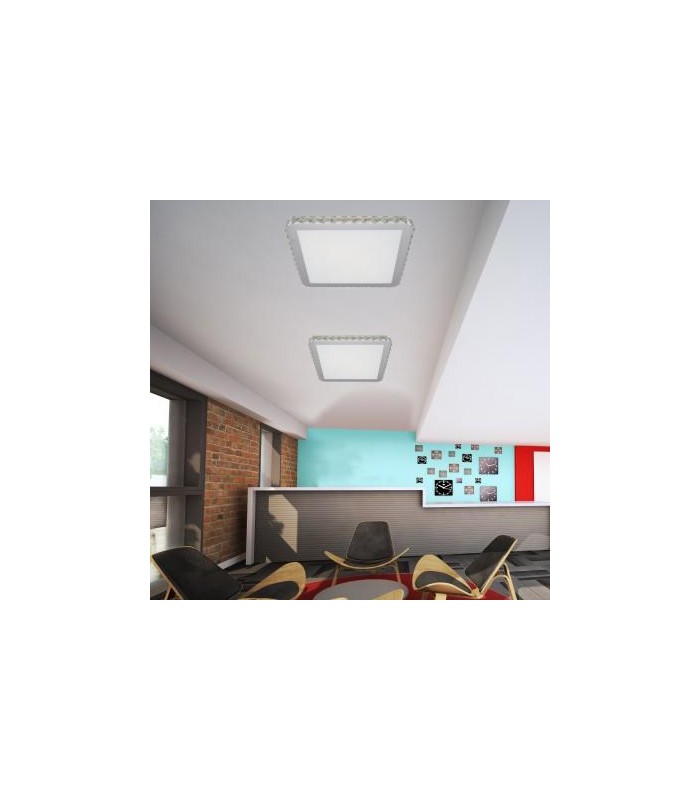 Wykonany w technologii Led z wysokiej jakości metalu chromowanego z przesłoną z mlecznego szkła, przyozdobiony szlifowanymi kryształkami ułożonymi ściśle obok siebie. Źródłem światła lampy jest wbudowany Led 24W ostrumieniu świetlnym 1440lm i barwie światła 3000K. Wysokość lampy 8 cm, szerokość lampy 40 cm x 40 cm.