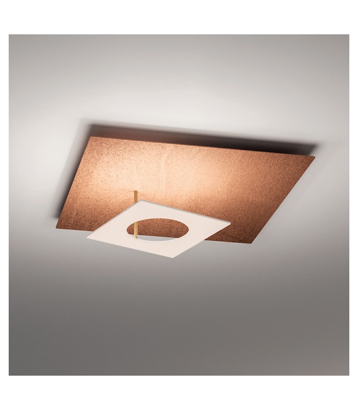 Nowoczesny plafon Włoskiej marki Icone, wykonany w technologii Led o wysokiej wydajności energetycznej- światło odbite i rozproszone. Wykonany z wysokiej jakości aluminium w kolorze biało-złotym z wbudowanym źródłem światła Led 16,8W o strumieniu świetlnym 2598ml i barwie światła 3000K. Długość zwisu lampy 20 cm, szerokość lampy 50 cm x 50 cm.