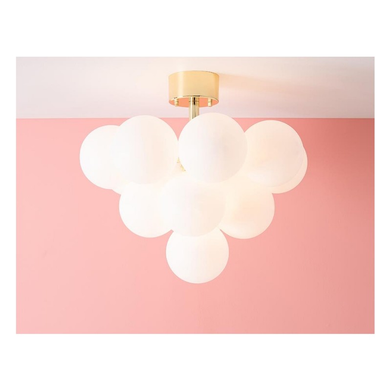 Wykonany z połączenia wysokiej jakości metalu w kolorze złotym ze szklanymi kloszami w kształcie kul w kolorze białym. Długość zwisu 52 cm, średnica lampy 56 cm. Możliwość stosowania źarówek LED.