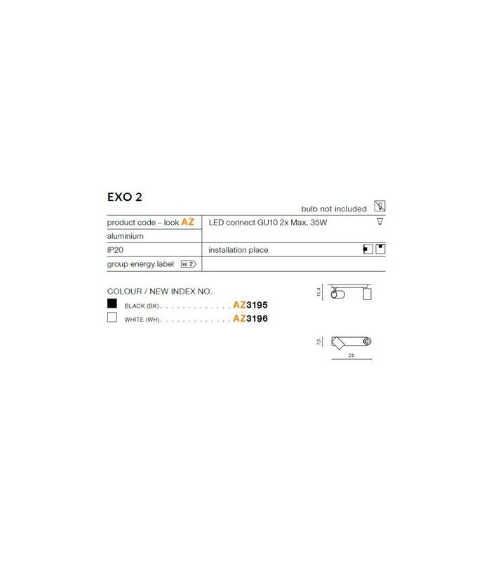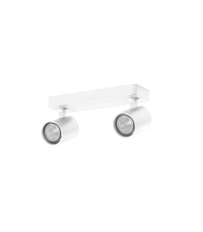 Wykonany z wysokiej jakości aluminium w kolorze białym z regulowanymi kloszami w kształcie tub na listwie. Wysokość lampy 11,4 cm, szerokość lampy 25 cm x 7,5 cm. Możliwość stosowania żarówek Led