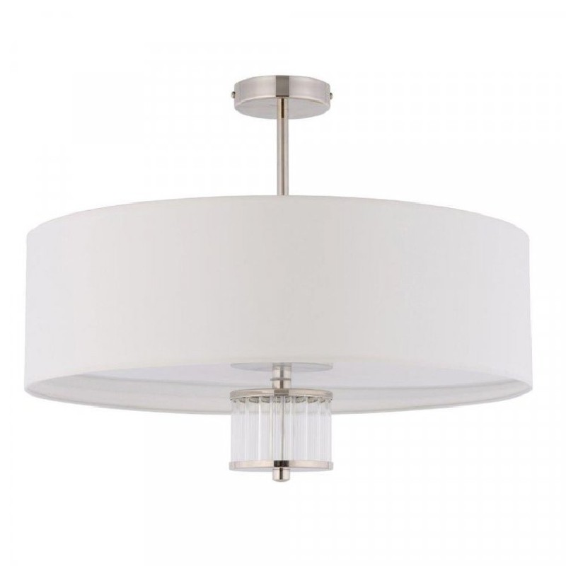 Wykonany z wysokiej jakości mosiądzu polerowanego w kolorze niklu z tkaninowym kloszem w kolorze białym i szklanym elementem dekoracyjnym. Długość zwisu lampy 40 cm, średnica lampy 50 cm, wysokość klosza 15 cm. Możliwość stosowania żarówek Led. Kolory opraw i abażurów wybieramy indywidualnie ze wzorników zamieszczonych na zdjęciach.